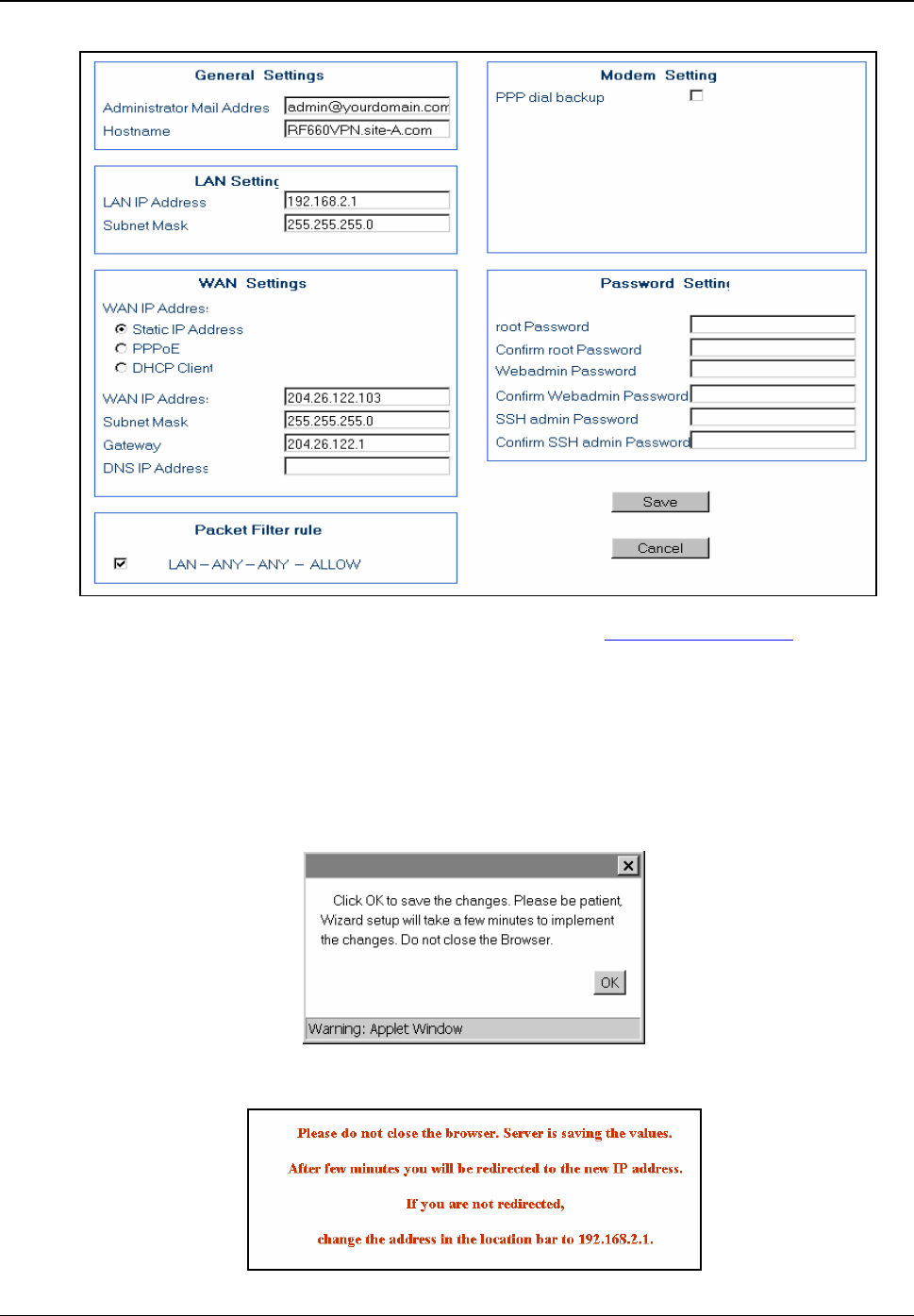 j) The following screen displays. Saving your settings will take a few minutes. Since you kept the LAN IP address