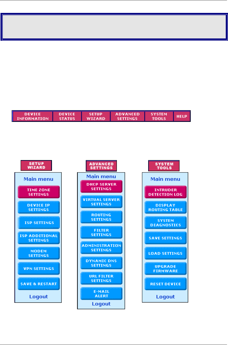 from one function to another: Device Information, Device Status, Setup Wizard, Advanced